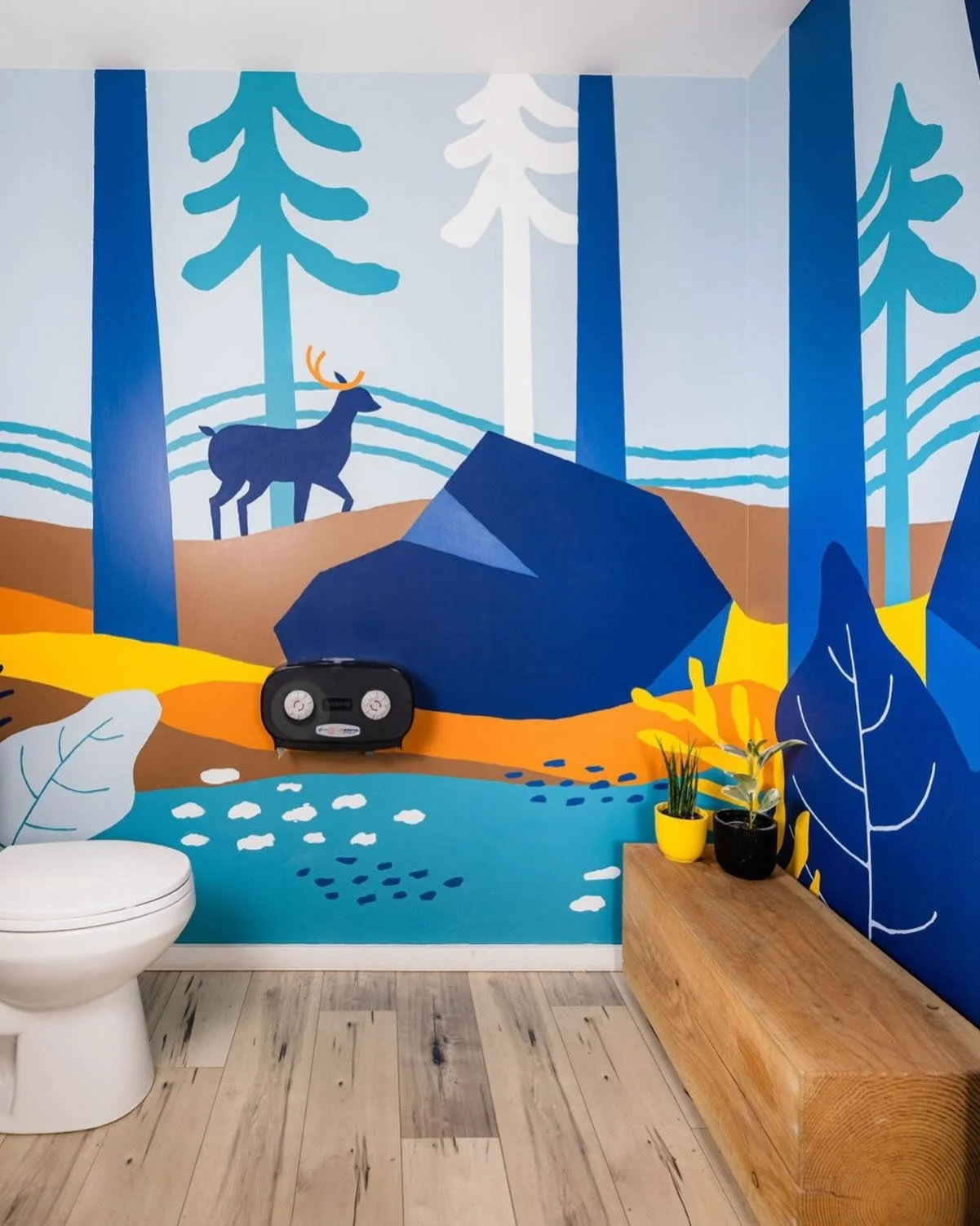 Trina and Helen worked with the Hangar on initial ideas, proposing a colourful wilderness scene inspired by the local Rainy River Bouldering area. As a full wrap around design, the washroom mural became an immersive experience into nature. Featuring a stylized forest scene scattered with boulders, flora, and fauna, the concept was inspired by the local outdoor bouldering area and brought much needed vibrancy to a lifeless room. A bold, high contrast palette inspired by the Hangar’s brand colours brought the design to life.